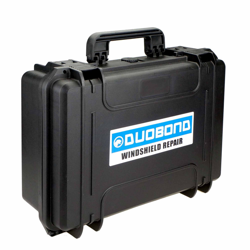 Professional windshield repair system with the repair bridge Fixter, rechargeable wireless IQ-r Led UV lamp and DART supplied in a solid dust repellent senior suitcase.
